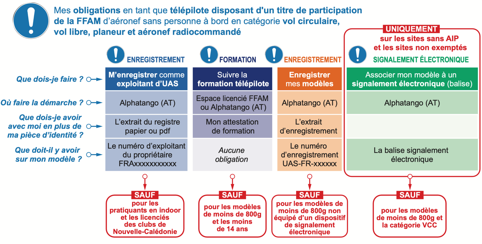 Pour voler en dehors d’un terrain de club : nécessité d’apposer sur ses modèles le numéro d’exploitant d’UAS correspondant au propriétaire ou à un propriétaire du modèle quelle que soit la masse du modèle et d’avoir sur soi le document (ex: pdf sur son téléphone).